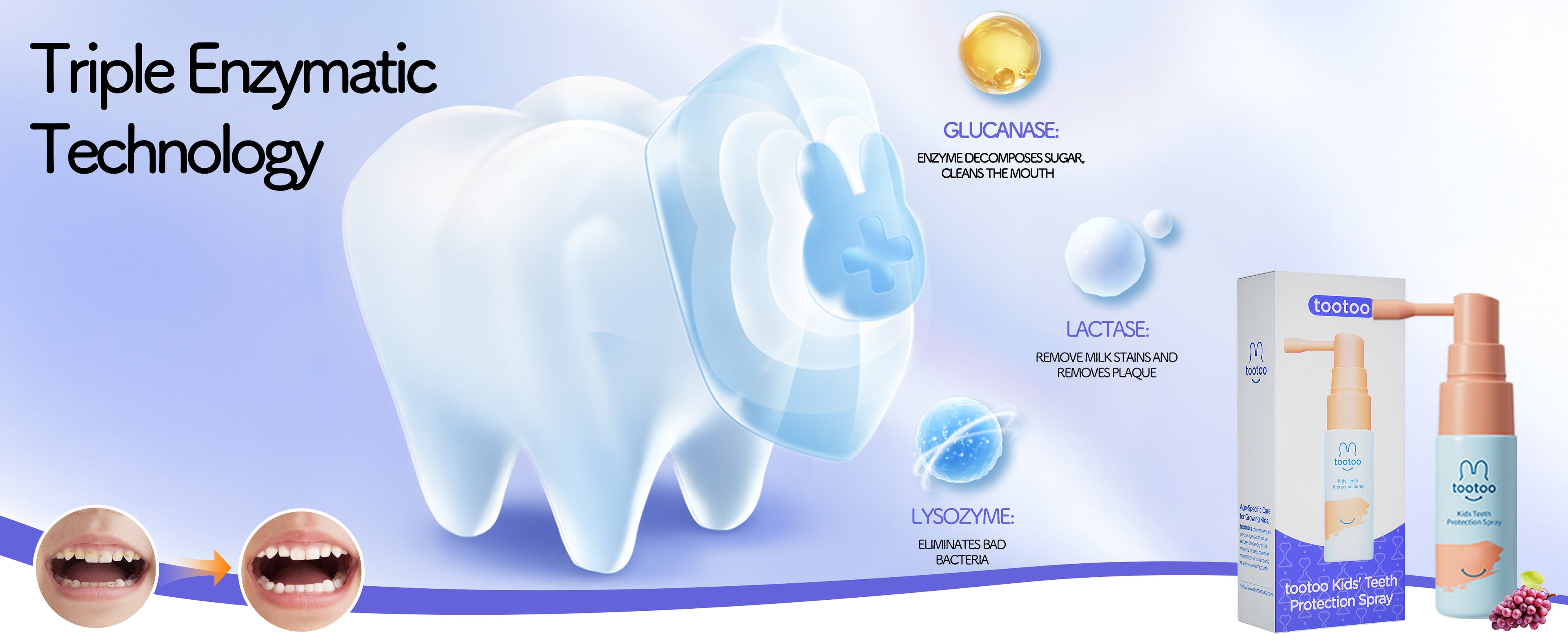 The tootoo kids oral spray uses innovative Triple Enzymatic Technology to clean teeth naturally without fluoride. Glucanase breaks down sugars and plaque, Lactase removes milk stains, and Lysozyme eliminates harmful bacteria — the three enzymes work synergistically to clean and protect.